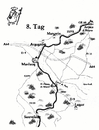 Also beschloß ich, noch ein paar Meter zu gehen. Dann ging ich entlang unserer Route und kam an einem Bäcker vorbei der früh morgens Brötchen backte. Ich bin einfach in die Stube hineingegangen. Französisch konnte ich nicht sprechen, also habe ich mich nur per Handzeichen zu ihm verständigt, was ich will. Das ich Durst habe und daß ich was zum Essen will. Er hat mir einen Kübel Wasser präsentiert und ein Stückchen Torte. Das war schon mal gut als Anfang. Danach ging ich dann von Arthez-de-Béarn raus und bin bis in den nächsten Ort gelaufen, wo ich dann den Bubi getroffen habe. Der erzählte mir, Peter hat mich gesucht, ist hin- und hergefahren und hat sich schon Sorgen um mich gemacht. Dann habe ich ihm erzählt, wie viele Kilometer ich gelaufen bin und wie viele Kilometer Gerd und ich uns verlaufen haben.